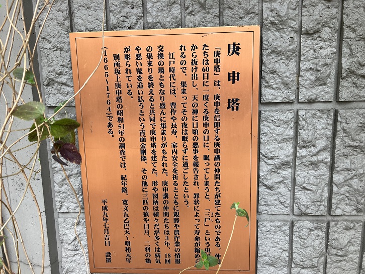 別所坂上で直角に折れ曲がる角に庚申塔が祭られた小祠があり、その横に案内板のプレートが壁に貼り付けられています。