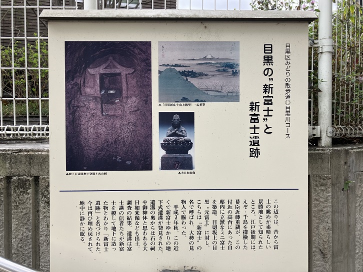 この辺りは、昔から富士の眺めが素晴らしい景勝地として知られたところ。江戸後期には、えぞ・千島を探検した幕臣近藤重蔵が、この付近の高台にあった自邸内に立派なミニ富士を築造。目切坂上の目黒”元富士”に対し、こちらは”新富士”の名で呼ばれ、大勢の見物人で賑わった。平成三年秋、この近くで新富士ゆかりの地下式遺溝が発見された。遺溝の奥からは石の祠や御神体と思われる大日如来像なども出土。調査の結果、遺溝は富士講の信者たちが新富士を模して地下に造った物とわかり「新富士遺跡」と名づけられた。今は再び埋め戻されて、地中に静かに眠る。