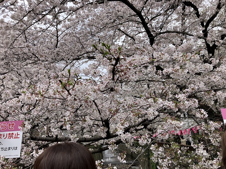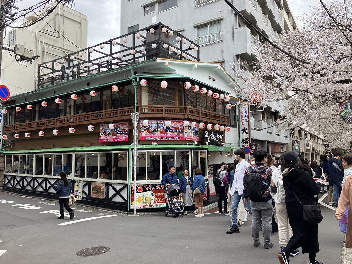 お花見といえば定番の宴会ですね。でも、目黒川の遊歩道では座り込んでの飲食は禁止されています。川沿いの飲食店とかテイクアウトのお店で調達して食べながらお花見をするしかありません。大樽さんも屋台のお店も年に一度のかき入れ時ですね。