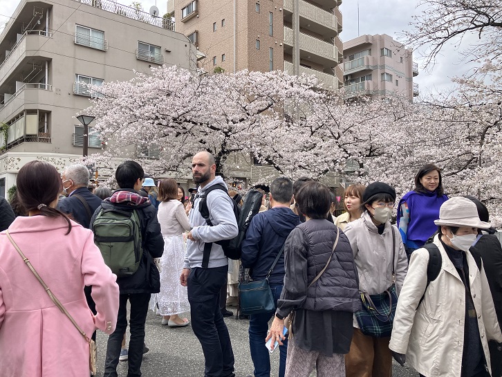 別所坂を下りて目黒川の遊歩道を中目黒方向に進みます。丁度桜は満開で、遊歩道は多くの花見客で賑わっています。海外からの観光客でしょうか、外人さんも大勢見かけます。