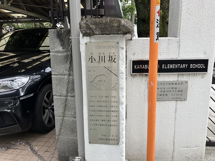 小川坂は長さが約360mほどの大きく弧を描きながら上る緩やかな坂です。坂名は、かってこの一帯の地名が「小川」だったことに因んで名付けられました。坂上の烏森小学校の校門脇の壁に案内板が貼られています。