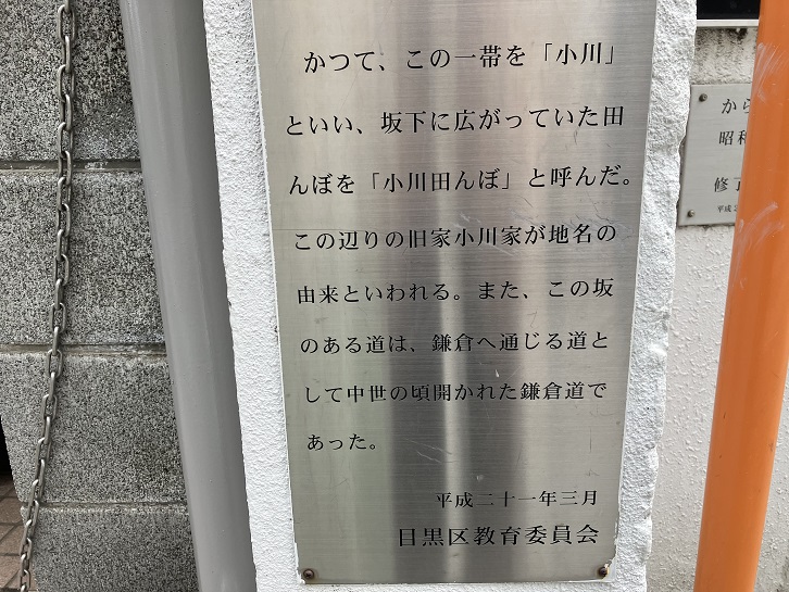 かつて、この一帯を「小川」といい、坂下に広がっていた田んぼを「小川田んぼ」と呼んだ。この辺りの旧家小川家が地名の由来といわれる。また、この坂のある道は、鎌倉へ通じる道として中世の頃開かれた鎌倉道であった。
