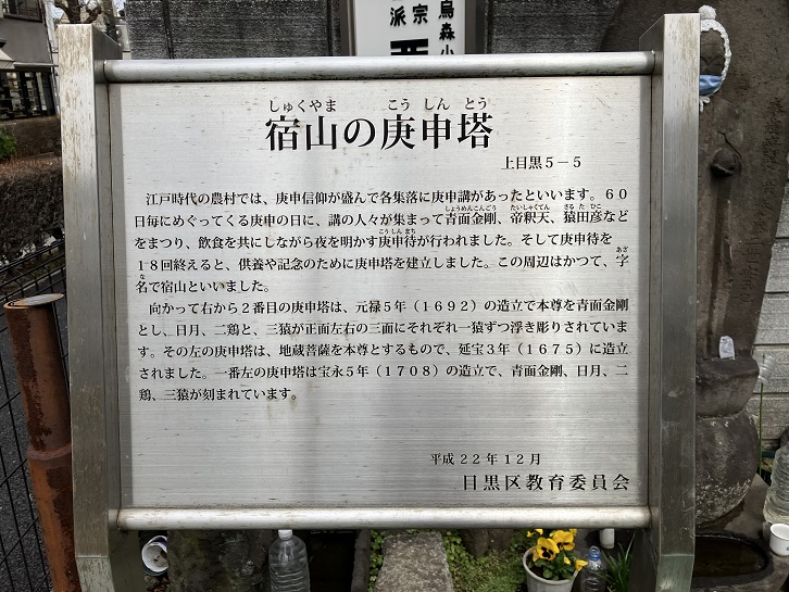 江戸時代の農村では、庚申信仰が盛んで各集落に庚申請があったといいます。60日毎にめぐってくる庚申の日に、溝の人々が集まって青面金剛、帝釈天、猿田彦などをまつり、飲食を共にしながら夜を明かす庚申待が行われました。そして庚申待を18回終えると、供養や記念のために庚申塔を建立しました。この周辺はかつて、字名で宿山といいました。向かって右から2番目の庚申塔は、元禄五年(1692年)の造立で本尊を青面金剛とし、日月、二鶏と、三猿が正面左右の三面にそれぞれ一猿ずつ浮き彫りされています。その左の庚申塔は、地蔵菩薩を本尊とするもので、延宝三年(1675年)に造立されました。一番左の庚申塔は宝永五年(1708年)の造立で、青面金剛、日月、二鶏、三猿が刻まれています。