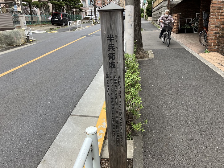 半兵衛坂は長さが約160mほどの緩やかな坂です。坂名は、江戸時代にこの辺りに清水半兵衛を代々名乗る旧家があったことに因んでいます。坂の中ほどに案内柱が立っています。