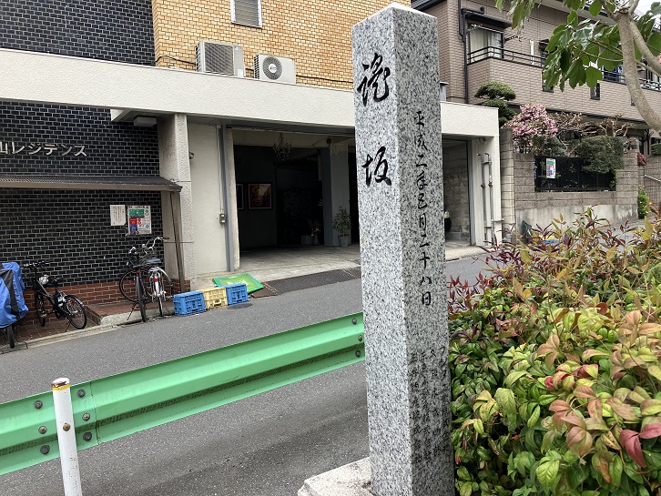 謡坂(うたいざか)は長さが約130mほどの緩やかな坂です。坂名は、昭和初期に坂の近くに謡の好きな人が住んでいたことに因んでいます。坂の中ほどのマンションの前に坂名を記した御影石製の碑が建っています。崩し文字が使われているので、初めて見た人は「謡」とは読めないかもしれません。