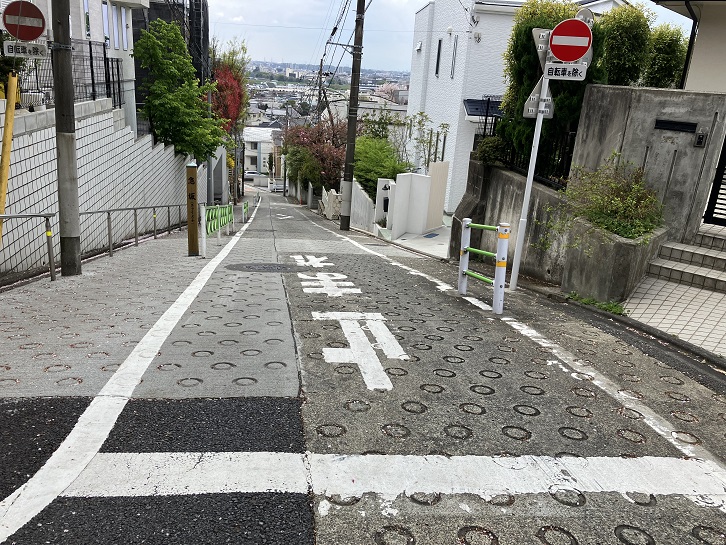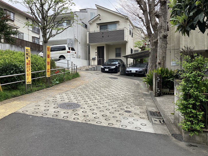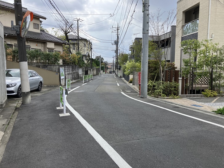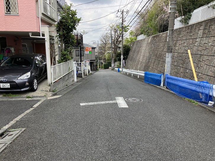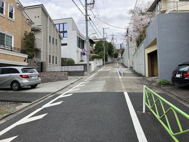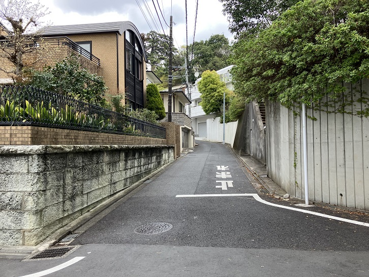 田園調布駅の西口から伸びる三本の放射状の銀杏並木の真ん中の道を進み、田園調布三丁目交差点を渡ってなおも進んだ先の田園調布五丁目5番地と6番地の間から長い坂が下っています。坂上付近は谷底を見下ろすような急な傾斜になっています。