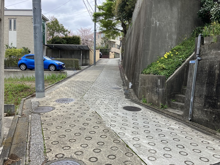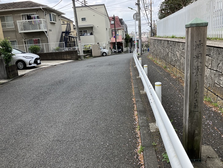 長坂の坂下手前から八幡神社と照善寺の裏を通る小道を進みますと、左手に緩く上がる坂が始まっています。途中で左右に曲がりながら住宅地の中を上がっていきます。