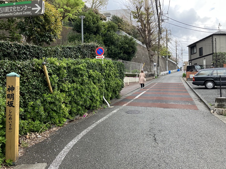 神明坂は長さが約140mほどのやや急な坂です。昔坂のそばに石川村の鎮守の神明社(現在の石川神社)があったことから神明坂と呼ばれました。坂上と坂下に案内柱が立っています。坂上の案内柱はかなり古く、木柱には亀裂が走って字も掠れています。