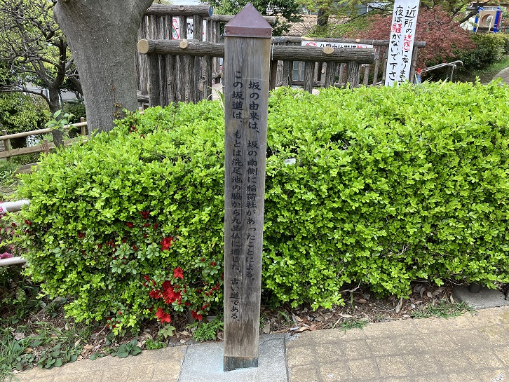 坂の由来は、坂の南側に稲荷社があったことによる。この坂道は、もとは洗足池の脇から九品仏に通じた、古い道である。
