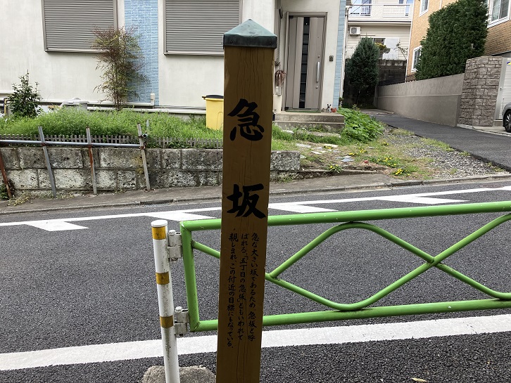 急坂は長さが約350mほどの急な坂です。別名を「五丁目の急坂」といいます。この道路は大正末期に行われた耕地整理により誕生しましたが、急な大きい坂道という形状から自然発生的に「急坂」という坂名で呼ばれるようになったのは戦後のことです。坂上付近と坂の中ほどに案内柱が立っています。