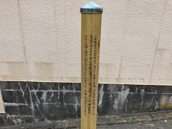 馬坂は長さが約220mほどの坂で、坂下は緩く、坂上になると急な上り坂になっています。昔は馬で引く荷車で台地へ上れる唯一の坂道であったために馬坂と呼ばれました。坂上付近に案内柱が立っています。