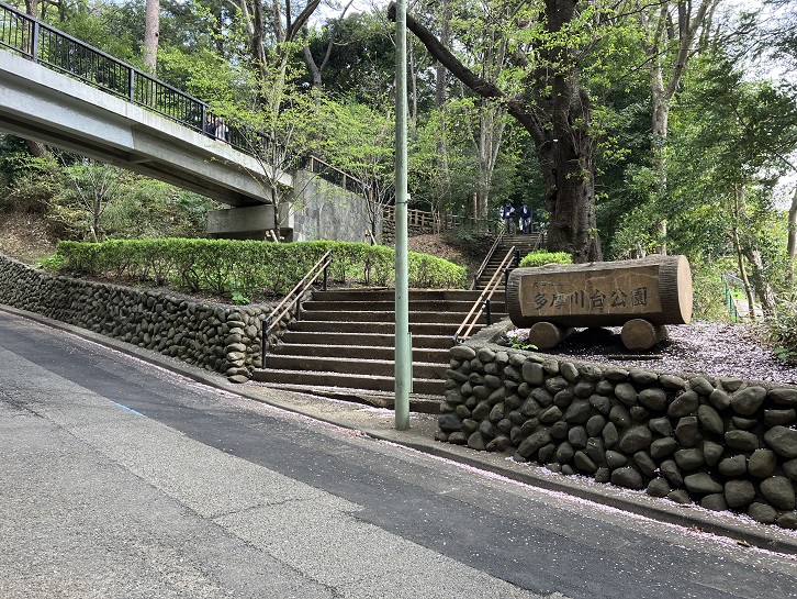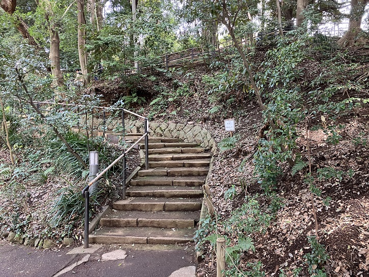田園調布せせらぎ公園には3つの坂(階段)があります。三番目の階段は真新しくて手摺りも付いています。階段の途中で向きを変えながら上がっています。