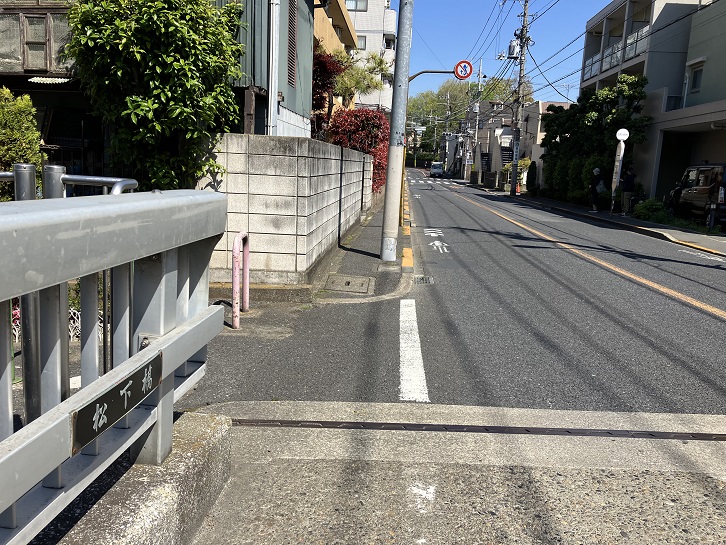下井草駅の脇を通る旧早稲田通りを南下し、妙正寺川に向かいます。銀杏稲荷公園前交差点から、妙正寺川に架かる松下橋の手前まで坂が下っています。