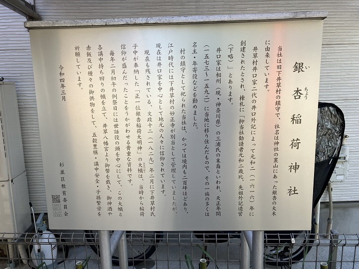 当社は旧下井草村の鎮守で、社名は神社の裏山にあった銀杏の大木に由来しています。井草村井口家二代の井口外記によって元和二年(1616年)に創建されたとされ、棟札に「抑当社勧請者元和二歳比、先祖外記造営(下略)」とあります。井口家は相州(現・神奈川県)の三浦氏の末裔といわれ、天正年間(1573年〜1592年)に当地に移り住んだもので、その一族の多くは名主・年寄役などを勤めました。村の鎮守として祀られた当社は、かつては境内も二百坪ほどあり、江戸時代には下井草村の妙正寺が別当として管理していましたが、現在は井口家を中心として地元の人々に信仰されています。現在も残されている、文政十二年(1829年)二月に下井草村氏子中が奉納した「正一位銀杏稲荷大明神」の大幟は、当時から稲荷信仰が盛んだったことをうかがわせる貴重な資料です。毎年二月初午の例祭日には世話役の頭を中心にして、この大幟と各講中持ち回りの幟を立て、井草八幡宮より御幣を戴き、御神酒や赤飯及び種々の御供物をして、五穀豊穣・講中安全・子孫繁栄を祈願しています。