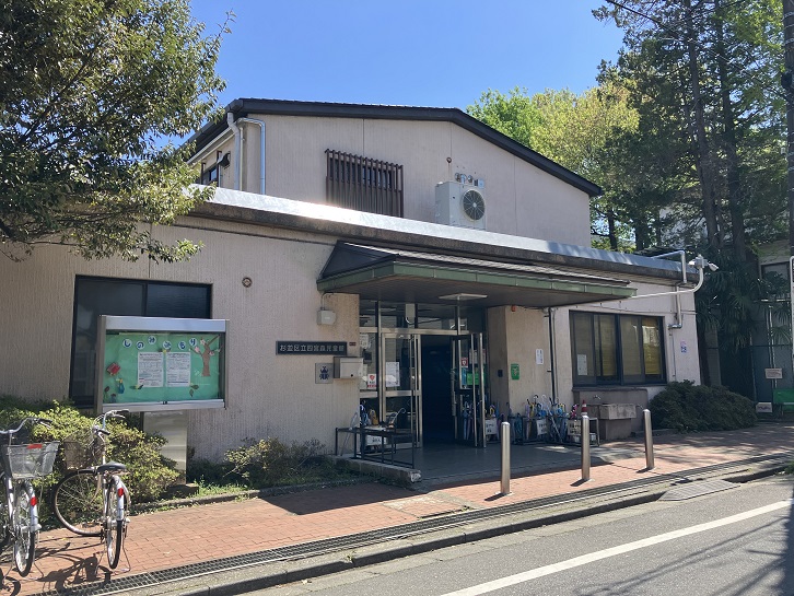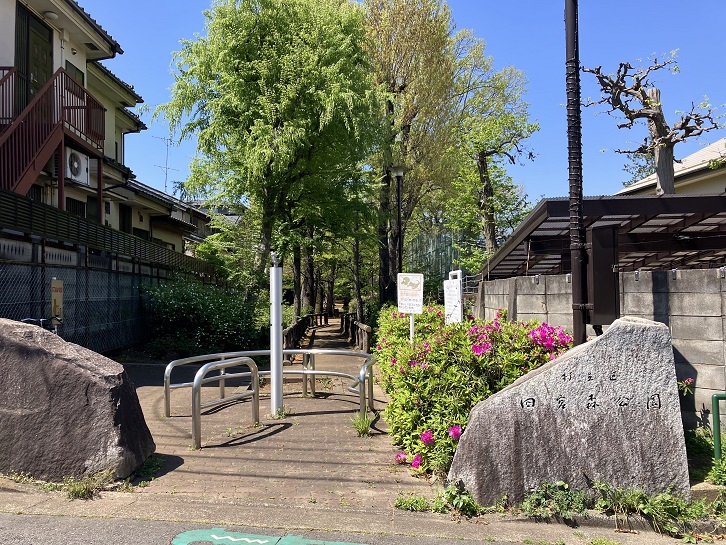 上井草一丁目交差点の1ブロック先の交差点で右折した先に、東西に細長く延びた敷地の木立に包まれた緑豊かな四宮森公園があります。