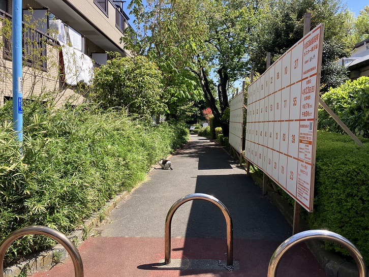 四宮森児童館の手前には井草川遊歩道が東西に延びています。遊歩道は児童館の先で向きを変え、先ほど通った道路と交差しています。猫ちゃんもお散歩中です。私が気になるのかな?