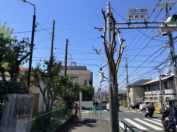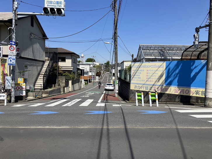 こども坂の坂上は四宮集会所前交差点となります。でも、どこに集会所があるのか分かりませんでした。交差点から1ブロック西に進んだところに四宮公園前交差点があります。四宮公園は四宮森公園とは別の公園で、交差点角に面しています。
