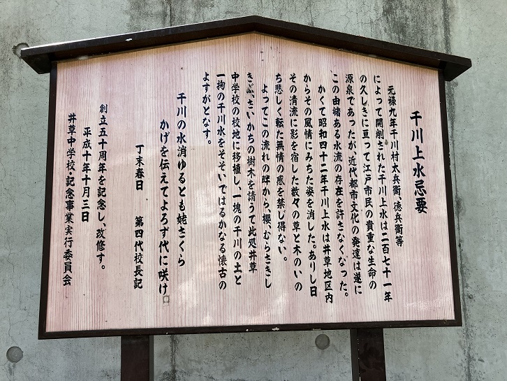 元禄九年千川村太兵衛、徳兵衛等によって開削された千川上水は二百七十一年の久しきに亘って江戸市民の貴重な生命の源泉であったが、近代都市文化の発達は遂にこの由緒ある水流の存在を許きなくなった。かくて昭和四十二年千川上水は井草地区内からその風情にみちた姿を消した。ありし日その清流に影を宿した数々の草と木のいのち悲しく転た無情の感を禁じ得ない。よってこの流れの畔から、櫻、むらさきしきぶ、さいかちの樹木を請うて此処井草中学校の校地に移植し、一塊の千川の土と一掬(いっきく:水などを両手ですくうこと)の千川水をそそいではるかなる懐古のよすがとなす。