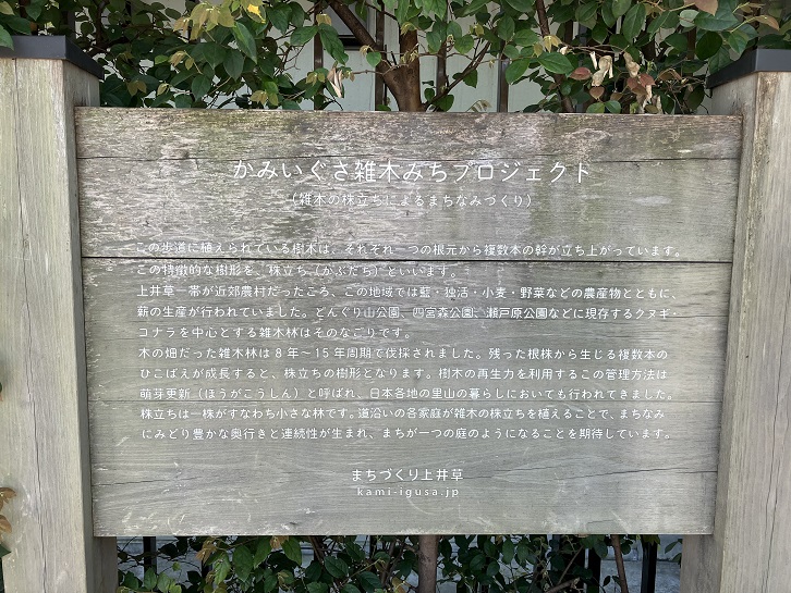この歩道に植えられている樹木は、それぞれ一つの根元から複数本の幹が立ち上がっています。この特徴的な樹形を、株立ち(かぶだち)といいます。上井草一帯が近郊農村だったころ、この地域では藍・独活(ウド)・小麦・野菜などの農産物とともに、薪の生産が行われていました。どんぐり山公園、四宮森公園、瀬戸原公園などに現存するクヌギ・コナラを中心とする雑木林はそのなごりです。木の畑だった雑木林は8年〜15年周期で伐採されました。残った根株から生じる複数本のひこばえ(樹木の切り株や根元から生えてくる若芽のこと)が成長すると、株立ちの樹形となります。樹木の再生力を利用するこの管理方法は萌芽更新(ほうがこうしん)と呼ばれ、日本各地の里山の暮らしにおいても行われてきました。株立ちは一株がすなわち小さな林です。道沿いの各家庭が雑木の株立ちを植えることで、まちなみにみどり豊かな奥行きと連続性が生まれ、まちが一つの庭のようになることを期待しています。