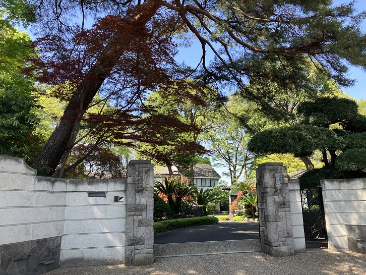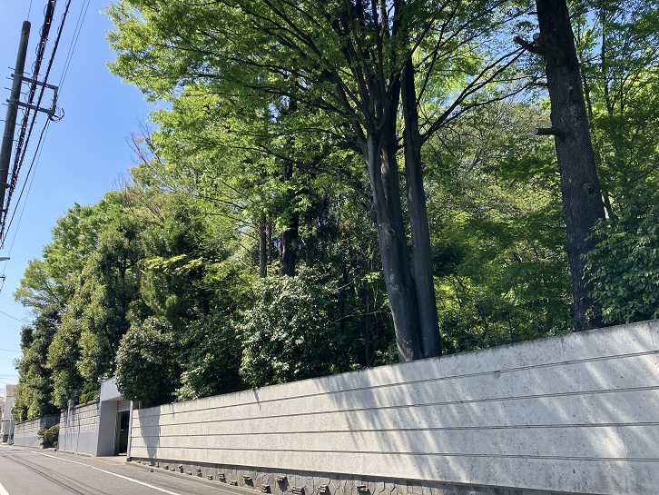 井草中学校の西側の生け垣に沿って坂が下っています。生け垣の間には何本かの桜の木が植えられています。桜の花は少し残っていますが、季節は青葉の候に移ろいつつあります。