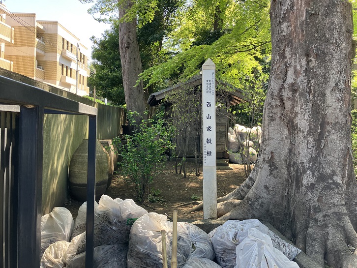 この穀櫃は、飢饉等の民間貯穀設備として、天保年間・旧上井草村字谷頭の西山助右衛門が作ったものです。内部は桁行が三等分に仕切られ、天井の半分が上げ蓋式で施錠ができ、土台上部には取り出し口があります。当時は、拠出穀物を貯える村共用櫃と個人用とがありました。この西山家所有の穀櫃は、製作年等の墨書銘があり、ほぼ完全な形を整えた区内唯一のもので、江戸時代の農村杉並の生活の様子を知る資料として貴重なものです。