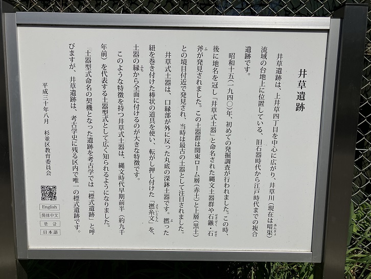 井草遺跡は、上井草四丁目を中心に広がり、井草川(現在は暗渠)流域の台地上に位置している、旧石器時代から江戸時代までの複合遺跡です。昭和十五年(1940年)、初めての発掘調査が行われました。この時、後に地名を冠し「井草式土器」と命名された縄文土器群や石鏃・石斧が発見されました。この土器群は関東ローム層(赤土)と上層(黒土)との境目付近で発見され、当時は最古の土器として注目されました。井草式土器は、口縁部が外に反った丸底の深鉢土器です。撚った紐を巻き付けた棒状の道具を使い、転がし押し付けた「撚糸文」を、土器の縁から全面に付けるのが大きな特徴です。このような特徴を持つ井草式土器は、縄文時代早期前半(約九千年前)を代表する土器型式として広く知られるようになりました。土器型式命名の契機となった遺跡を考古学では「標式遺跡」と呼びますが、井草遺跡は、考古学史に残る区内で唯一の標式遺跡です。