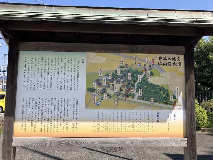早稲田通りを西に進むと直ぐに井草八幡前交差点に出ます。青梅街道に面して井草八幡宮の大鳥居が建っていて、その脇に井草八幡宮の由緒を記した案内板が立っています。建物の配置が一目で分かりますね。