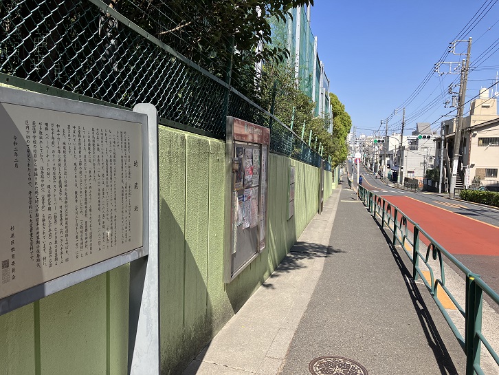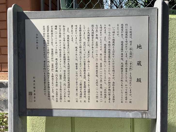 地蔵坂は長さが約180mほどの緩やかな坂です。別名を「御立場坂・寺分坂」といいます。坂名は、かつて坂の途中に地蔵堂があり、地蔵菩薩などが祀られていたことに因んでいます。坂の中ほどの荻窪中学校の前に案内板が立っています。