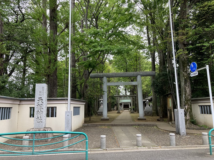 稲荷坂の坂上から南に向かいますと、広大な神明天祖神社に突き当たります。神明天祖神社は、戦国時代に伊賀国(現在の三重県)の農民が此の地に移住し、伊勢大明神を祀ったのが起こりであると伝えられています。