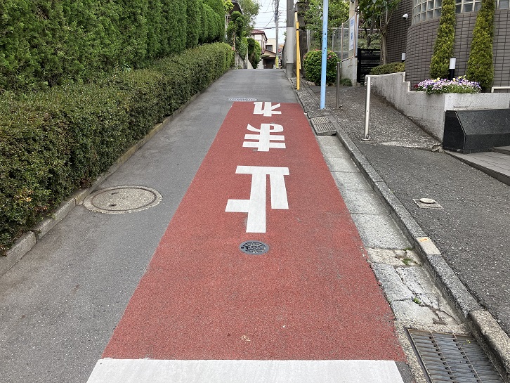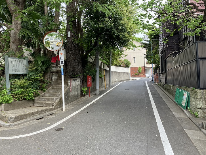 次の坂は稲荷坂から南西にかなり離れたところにあります。神明天祖神社から八丁通りを南に進み、神明通りを越えて住宅地の路地を進みます。五日市街道・井ノ頭通りを渡って更に住宅地の路地に迷い込みます。地図と今いる場所の番地の標識を見比べても自分がどこにいるのかサッパリ分かりません。迷いに迷って目的の坂を見つけるまで随分と時間がかかりました。見つけた途端に以前歩いた記憶が蘇ってきたんですけど。