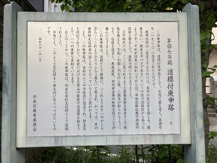 この庚申塔は、道標付庚申塔として、区内で最も古く、享保七年(1722年)に造立されたものです。庚申信仰は「長生きするためには、庚申の夜は身を慎しみ、諸善を行い、徹夜をすべきである」という中国の道教説から始ったようです。それが日本に伝わってからは、中世以降仏教や神道の信仰と習合して、庶民の間にひろまりました。江戸時代には、ここに見られるような青面金剛を本尊として邪鬼を踏まえ、不見・不聞・不言の三猿、二鶏等が彫られるようになり、石塔を造立し、悪疫退散、村内安全等の祈願を行うことが盛んになりました。この庚申塔は、道標として側面に、「これよりみぎいのかしら三ち」・「これよりひだりふちう三ち」と刻まれ、かっては、井の頭弁財天信仰者の道しるべとなっていたように思われます。また、この庚申塔は、当初からこの分岐点に造立され、願主名も列記されており、近世における久我山の歴史や交通路を知るうえで、一つの重要な資料といえます。以上のことから、この庚申塔は、杉並区有形文化財として登録されました。今後とも、このような文化財を一層大切に守りつづけたいものです。
