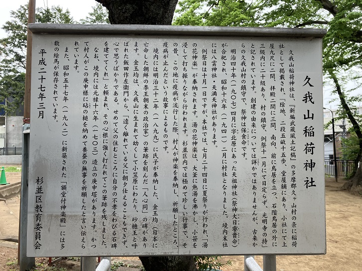 久我山稲荷神社は、「新編武蔵風土記稿」の多摩郡久ヶ山村の条に稲荷社として掲載され、「除地、二段五畝十五歩、堂屋舗にあり、小社にて上屋九尺に二間、拝殿二間に三間、南向、前に鳥居を立つ、石階鳥居の外に三級内に二十級あり、村の鎮守、例祭十一月にて日定らず、光明寺の持」と記されています。創建の由来については詳かではありませんが、古来からの久我山村の鎮守で、祭神は保食命です。明治四十年(1907年)四月に字北原にあった天祖神社(祭神大日【メ】貴命)が合祀され、昭和十六年(1941年)二月に村社となりました。境内末社には八雲神社・天満天神社があります。例祭日は十月一日ですが、本社では、七月二十四日に夏祭りが行われ、「湯の花神楽」が奉納されます。湯の花神楽は、大釜に熱湯を沸かし、小笹を浸して打ち振りながら行われます。杉並区内では極めて珍しい行事で、その昔、この地に疫病が流行した際、村人が神楽を奉納し、祈願したところ、疫病が止んだという故事によるものです。境内には明治三十二年(1899年)に氏子が奉納した、金玉均(日本に亡命した朝鮮の李王朝末の政治家)の筆跡を刻んだ「人心同」の碑があります。金玉均は、久我山に生まれて幼くして小笠原にわたり、砂糖王と呼ばれた飯田作左衛門から、「遠く離れている父に朝夕仕えることもできず、心で思うばかりである。せめて父の住むところに自分の不孝をわびる石碑を建ててくれ」と頼まれ、その心根に強く打たれてこの筆跡を残しました。なお、境内には元禄十六年(1703年)造立の庚申塔があります。かつて村人がこの庚申様に砧の槌を納めて養蚕の無事を祈願したと言い伝えられています。また、昭和五十七年(1982年)に新築された「額堂付神楽殿」には多数の絵馬が保存されています。