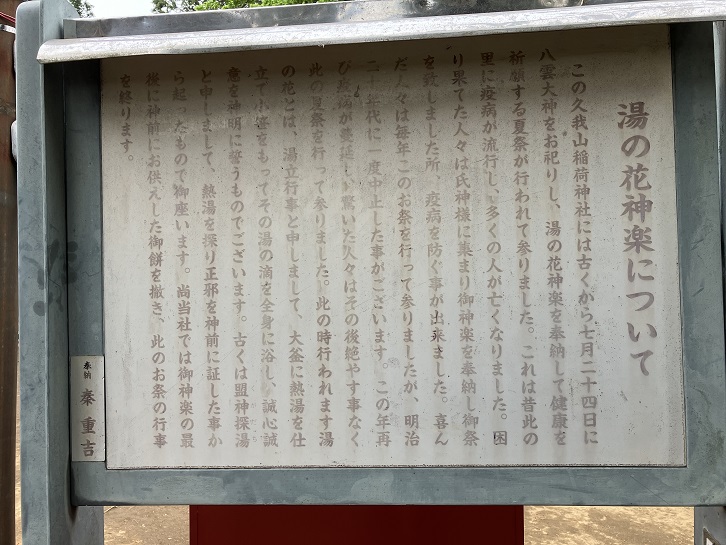 この久我山稲荷神社には古くから七月二十四日に八雲大神をお祀りし、湯の花神楽を奉納して健康を祈願する夏祭が行われて参りました。これは昔此の里に疫病が流行し、多くの人が亡くなりました。困り果てた人々は氏神様に集まり御神楽を奉納し御祭を致しました所、疫病を防ぐ事が出来ました。喜んだ人々は毎年このお祭を行って参りましたが、明治二十年代に一度中止した事がございます。この年再び疫病が蔓延し、驚いた人々はその後絶やす事なく此の夏祭を行って参りました。此の時行われます湯の花とは、湯立行事と申しまして、大釜に熱湯を仕立て小笹をもってその湯の滴を全身に浴し、誠心誠意を神明に誓うものでございます。古くは盟神探湯と申しまして、熱湯を探り正邪を神前に証した事から起ったもので御座います。尚当社では御神楽の最後に神前にお供えした御餅を撒き、此のお祭の行事を終ります。