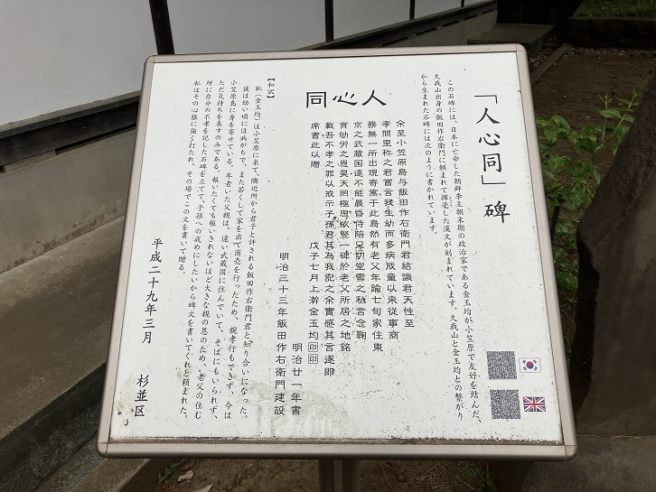 この石碑には、日本に亡命した朝鮮李王朝末期の政治家である金玉均が小笠原で友好を結んだ久我山出身の飯田作右衛門に頼まれて揮毫した漢文が刻まれています。久我山と金玉均との繋がりから生まれた石碑には次のように書かれています。