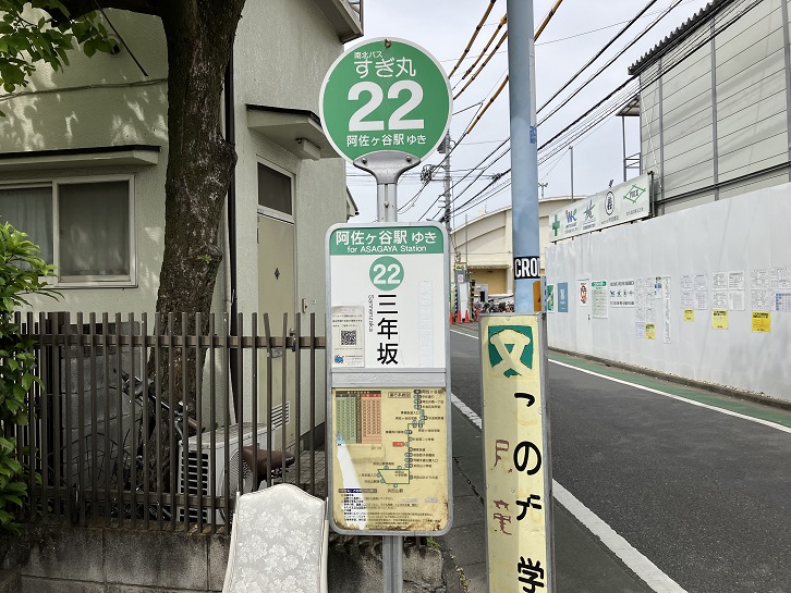 三年坂は長さが約95mほどの緩やかな坂です。坂名の由来は不明です。坂上付近にあるバス停の表示は「三年坂」となっています。現在、杉並第二小学校は建て替え中ですが、以前は小学校敷地の南西角に案内板が立っていたそうです。