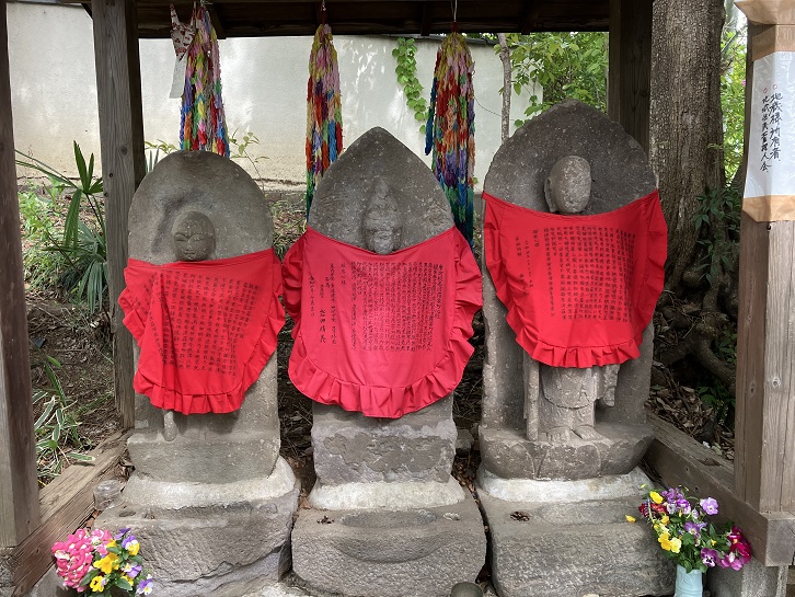尾崎橋を渡った直ぐ先の文武館道場前で左折しますと、路地の先が二股に分かれています。二股路の分岐点には、念仏講中が建立した地蔵菩薩と宝暦十年の銘が刻まれた馬頭観音が祀られています。