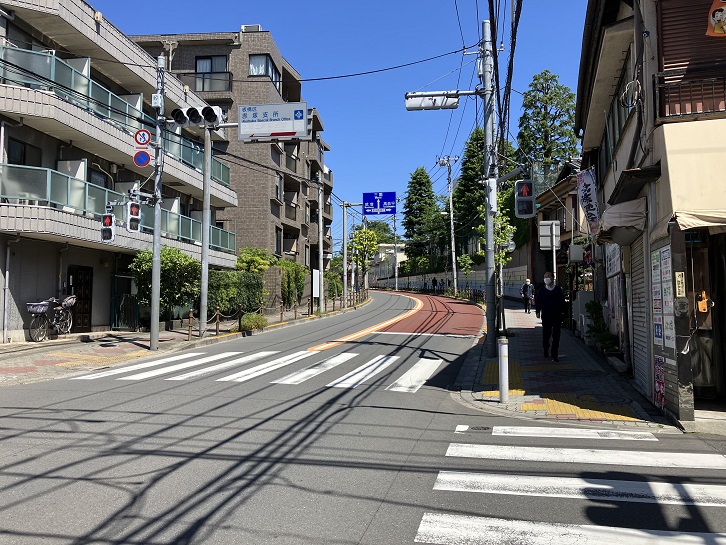 鷹番ノ坂は長さが約350mほどの緩やかな坂です。坂名の由来は明らかではありませんが、徳丸ヶ原はかつて徳川将軍代々の鷹狩りの場所であったことから、鷹番の番所に因んで坂名が付けられたのではないかと考えられます。2ケ所の交差点を過ぎるまでは徳丸通りを進みます。