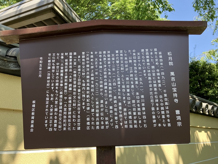 延徳四年(1492年)、千葉自胤は当寺を菩提寺と定め、寺領を寄進し、自ら中興開基となりました。開山堂には開基の位牌をまつり、本堂西側墓地には自胤のほか比丘尼了雲の墓碑が建てられています。天正十九年(1591年)、徳川家康は四十石の朱印地を当寺に寄進し、朱印状を発給しました。以降、江戸時代を通じて、歴代将軍が発給した朱印状が、「徳川将軍朱印状」(板橋区指定有形文化財)として現存します。原則では将軍の代替りごとに返還するため、貴重な例です。天保十二年(1841年)、長崎の町年寄で西洋砲術家でもあった高島秋帆が、幕命により、徳丸原で洋式砲術の調練を行いました。秋帆が当寺を本陣にした由緒から、遺品が伝わるほか、大正十一年(1922年)に東京陸軍兵器長を務めた押上森蔵を発起人として建てられた「火技中興洋兵開祖高島秋帆紀功碑」(板橋区登録有形文化財)も境内に残ります。また、赤塚六丁目四十番七号に所在する近世建築「大堂」(板橋区登録有形文化財)に伝わった国重要美術品「大堂 銅鐘」(板橋区登録有形文化財、板橋区郷土資料館寄託)や「大堂阿弥陀如来坐像」「大堂閻魔王坐像」(板橋区登録有形文化財)など、中世以来の由緒をもつ大堂に関わる貴重な文化財も現存しています。なお、大堂は大正十四年に都旧跡(当時は府)にも指定されています。