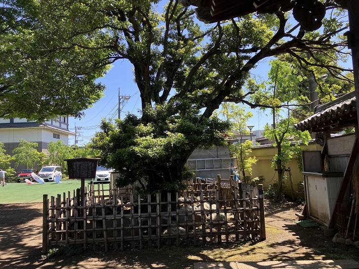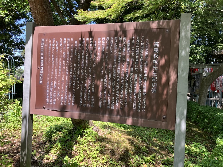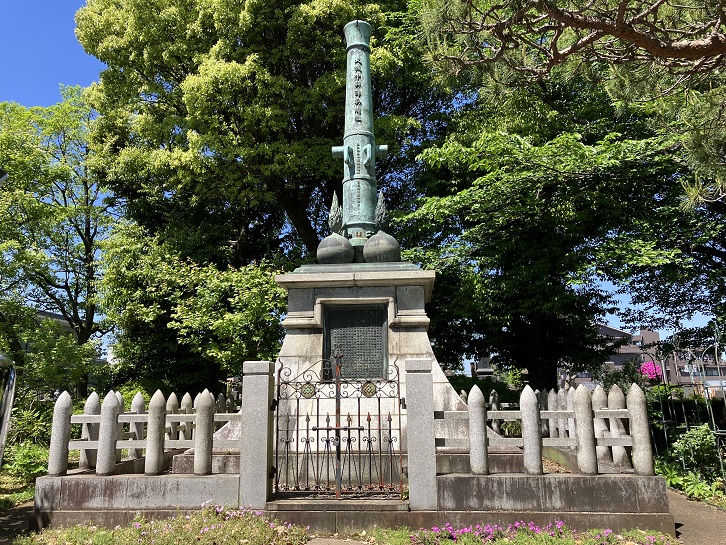案内板にも書かれていた「火技中興洋兵開祖高島秋帆紀功碑」は境内の奥に建っています。台座の上には砲身、コンクリート製の柵は砲弾というのも珍しいですね。台座にはめ込まれているプレートには何やら書かれていますが、難しくて読み取りは諦めました。