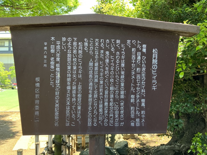 樹種、ひいらぎ(モクセイ科)。樹高約十メートル。目通り、約二百七十センチメートル。根回り、約三百十センチメートル。樹齢、約百年(推定)。ヒイラギは厚い常緑の葉の鋸歯(ぎざぎざ)が鋭く、さわるとひいらぐことから、この由来が出ている。ヒイラギの小枝と鰯の頭を節分の門辺にさし、鬼の侵入を防ぐという習俗は最近までみられる。また、ヒイラギの葉は若木では鋸歯が鋭く、古木になると鋸歯は消滅して全緑となり丸くなることから、人間の成長の過程を象徴するとの説話も残る。松月院のヒイラギは、上部の樹冠の葉は丸く、下部の若い枝の葉は尖った鋸歯を持つている。このような説話の葉の特徴を備えた古木は区内には珍しい。平成六年度、板橋区登録文化財の天然記念物(名木・巨樹・老樹等)とした。