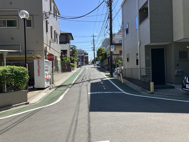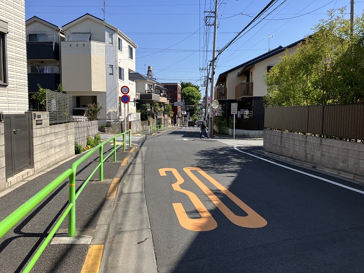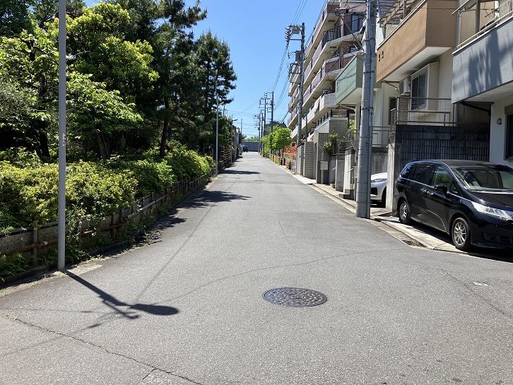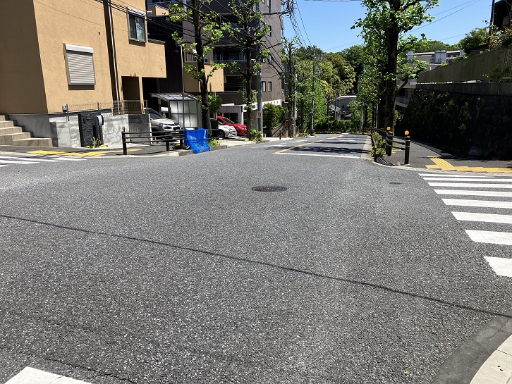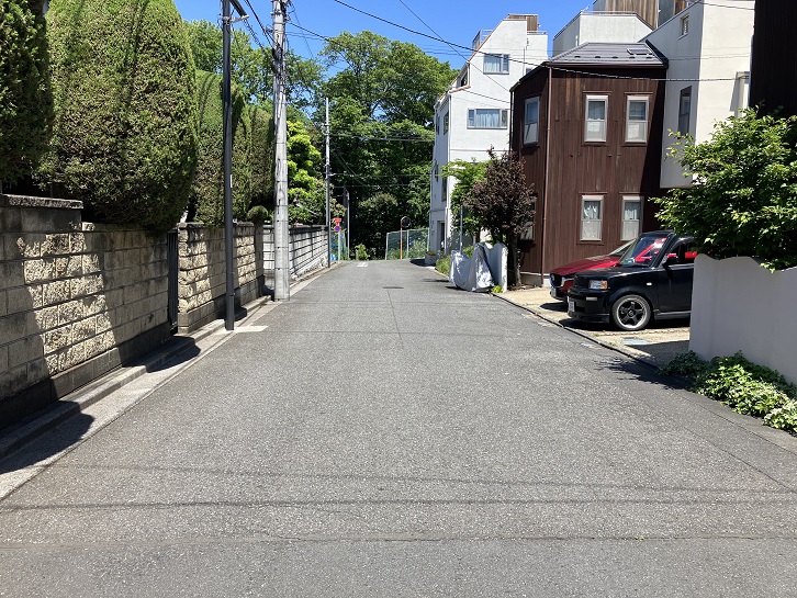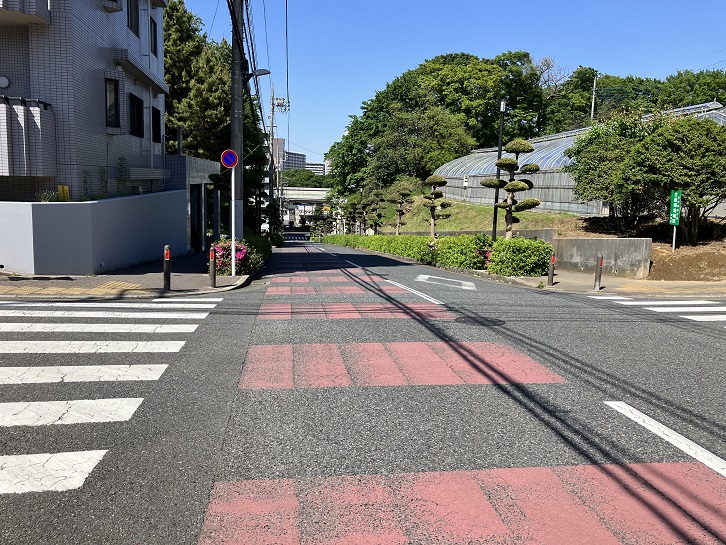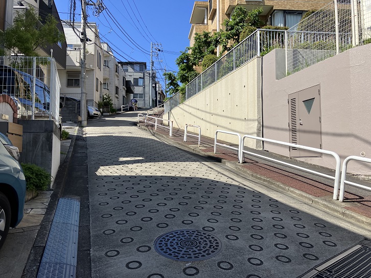 天神坂の坂下から路地を抜けて徳丸通りに出ます。徳石公園の南端付近から松月院通りまで長い坂が上がっています。