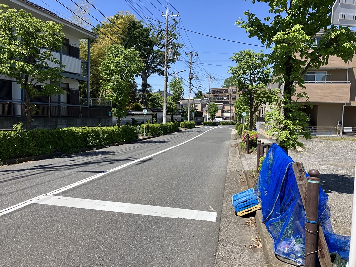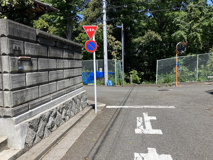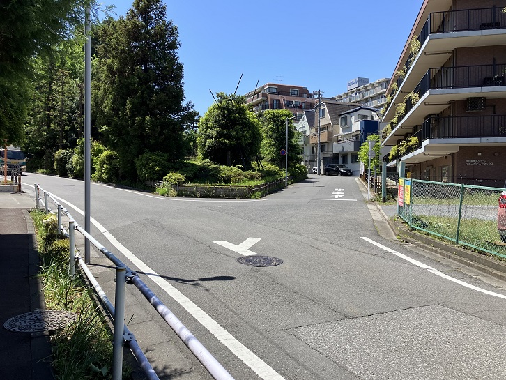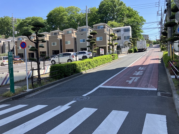 山の坂の途中の二股路にある老人ホーム「ブルーポピー」前から左手の道路に入り、大門東の森緑地の角で二股路を右手に進みます。緑に囲まれて環境が良いのか、この辺りには老人ホームとかリハビリ施設が多いですね。
