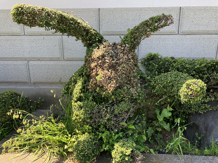 坂上近くの民家の塀の前に植え込みがあり、そこに動物の形に刈り込んだ植木が並んでいます。英国式庭園などで見かけるのですが、トピアリーというのだそうです。トピアリーとは、ラテン語の「opus topiarium」を語源とし、「植物を人工的・立体的に形づくる造形物」のことです。広い意味では、日本の菊人形もトピアリーの一種になるのだそうです。顔の部分の葉の色が変色しているのも意図的なのかな?