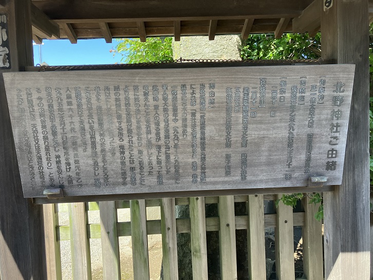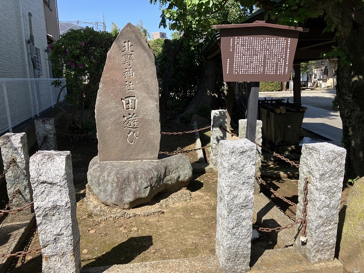 北野神社に伝わる縁起「武蔵国豊嶋郡徳丸郷天神宮紀」によると、長徳元年(995年)、京都北野天満宮から分霊し、徳丸の地に勧請されて当社が造立されました。祭神の菅原道真は、平安時代の学者で右大臣に任じられ重用された人物です。のちに藤原時平の策謀によって九州の太宰府に流され、その地で亡くなりました。没後は天神とあがめられ、学問、能筆の守り神として庶民から信仰を集めています。当社で行われる無形民俗文化財「田遊び」は、毎年二月十一日(旧暦正月十一日)の夜、その年の五穀豊穣や子孫繁栄を祈願して行なわれる予祝の祭事です。当社を造立したときにその奉祝行事として「田阿曽美之祭」を行ったのが始まりとされています。創始の長徳年間から一千年にわたって休むことなく行われてきたとされ、土地の神を招き、稲作の一年間の行事を所作と唄で表わす古い形を残した祭りです。唄や所作、言葉は口伝えで継承されており、全国的に見ても希有なことから国の重要無形民俗文化財に指定されています。また、毎年五月には獅子舞が行なわれ、悪疫の退散と子どもの無事生長が祈願されます。