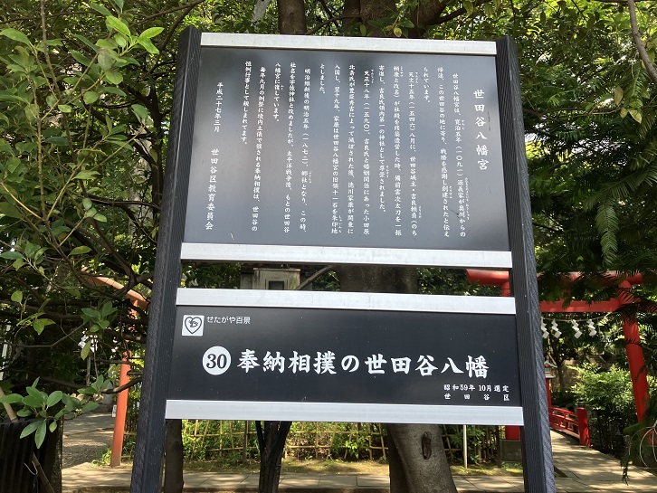 世田谷八幡宮は、後三年の役(永保三年【1083年】〜寛治元年【1087年】)の帰途の寛治五年(1091年)に源義家がこの宮の坂の地で豪雨に会い、天候回復を待つために滞在することとなりましたが、その際に今回の戦勝は日頃氏神としている八幡大神の加護によるものと思い、豊前国の宇佐八幡宮の分霊をこの地に勧請し祀ったのが始まりです。後に世田谷城主七代目の吉良頼康が天文十五年(1546年)に社殿を再興させ、これが実質的な創建の時と考えられています。かつては奉納相撲の勝敗によって翌年の豊作・凶作を占ったり、その年の豊作を感謝したため、境内には土俵や力石があります。渋谷氷川神社・大井鹿嶋神社と共に、江戸郊外三大相撲のひとつとされていました。今でも毎年秋の例祭(9月15日)には東京農業大学相撲部による奉納相撲が行われています。