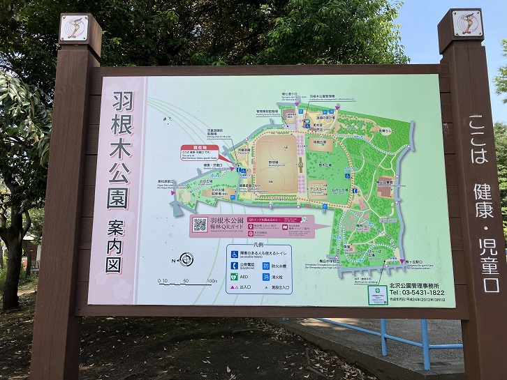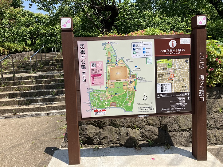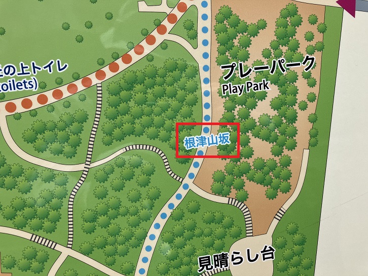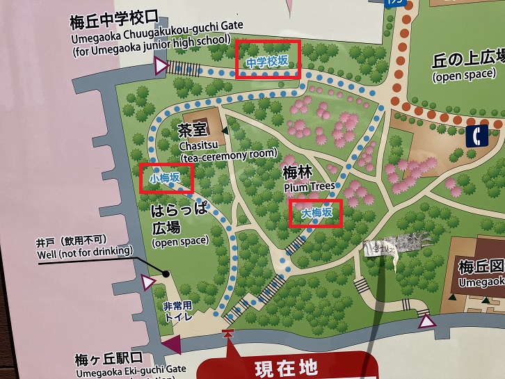 坂学会の坂リストには羽根木公園にある5つの坂が掲載されているのですが、どれも解説が未作成になっていて詳細がわかりません。私は今まで何度も羽根木公園を訪れたのですが、公園内に坂があるとは露とも思っていませんでした。不安を抱えながらも現地に行ってみますと、ナント公園の案内図に坂名が掲載されているのです。案内図は何回も見たのですが、坂名には一回も気が付きませんでした。公園の梅ヶ丘駅口付近には、正面に「大梅坂」、左手に「小梅坂」、そして奥に「中学校坂」があります。また、梅丘図書館の右手には「根津山坂」があります。