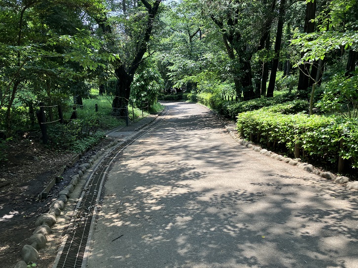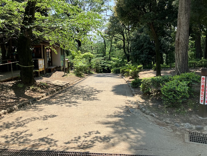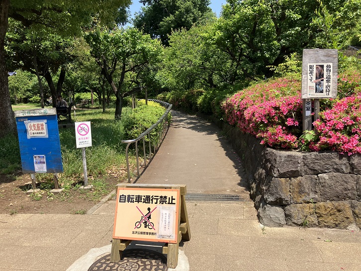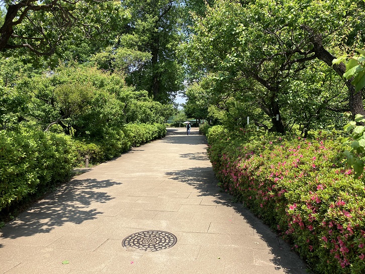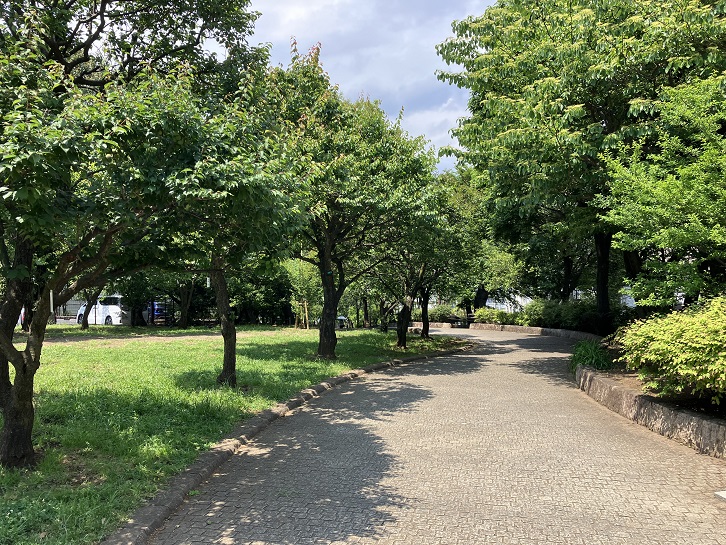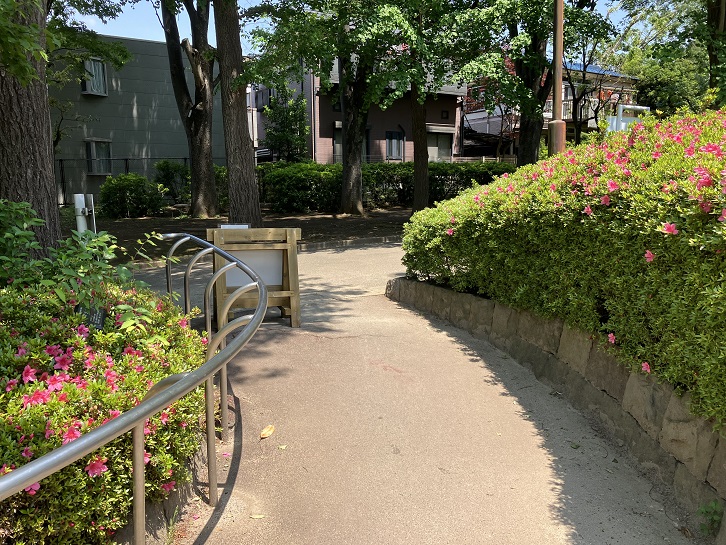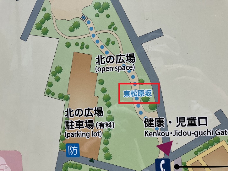 公園の北端にある健康・児童口から道路を挟んで「北の広場」が続いています。北の広場の入口の先から公園内に短い坂が下っています。