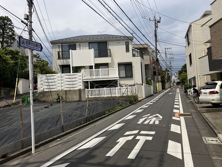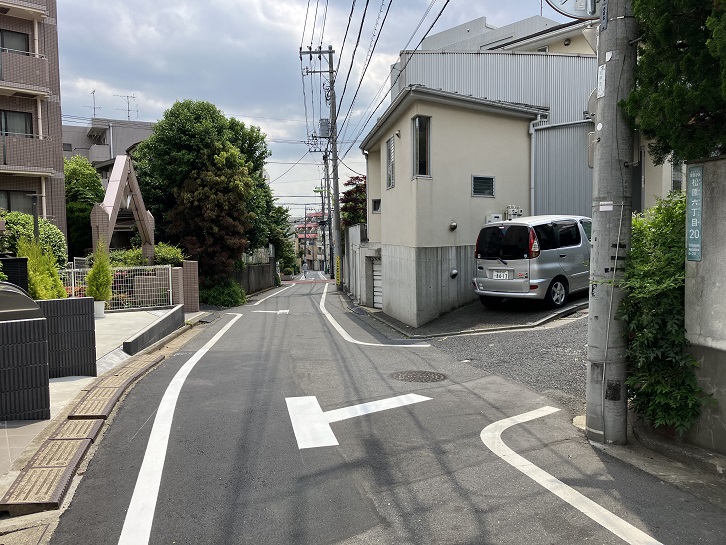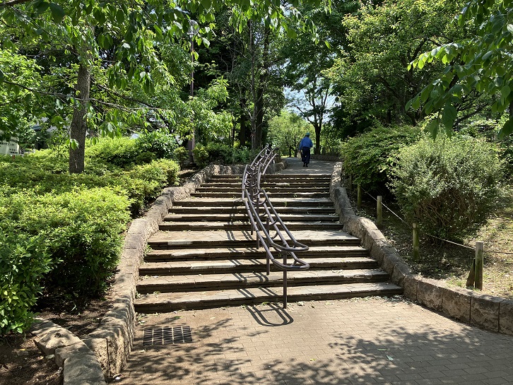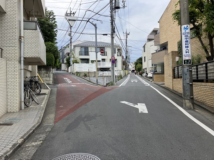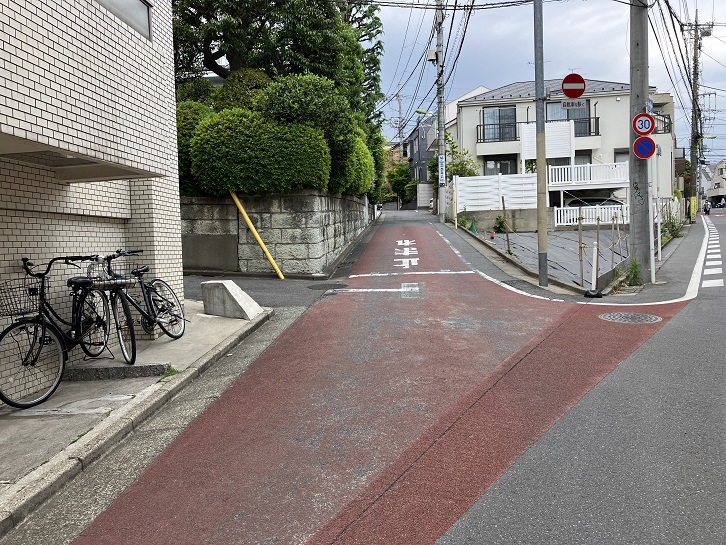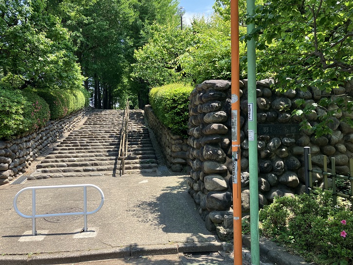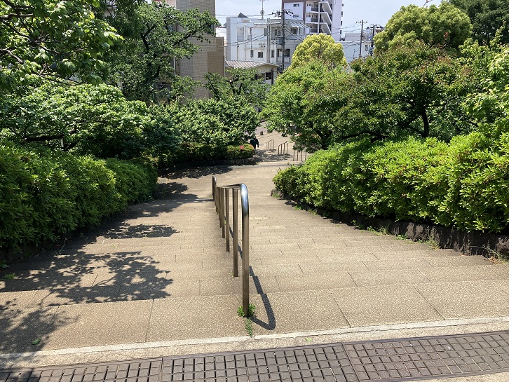 大梅坂の坂上から梅丘中学校の手前まで坂が下っています。坂下付近は階段になっています。