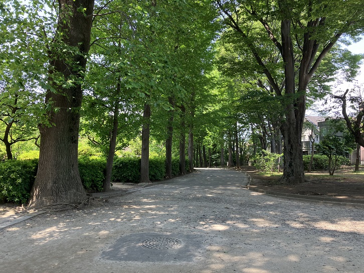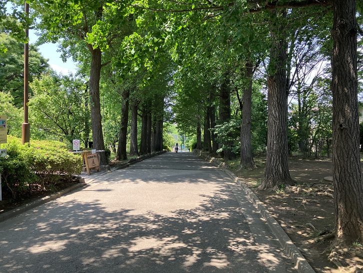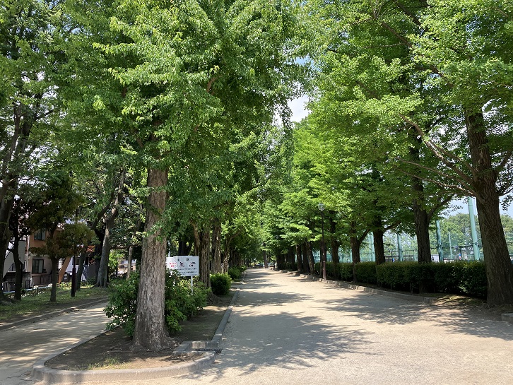 羽根木公園の北側には、二面の野球場やダブルコートのテニス場などの運動施設が集まっています。野球場のフェンスに沿って3列の銀杏並木が続いています。等間隔に植えられた銀杏の木は巨樹に育っていて、日差しの強い夏には木漏れ日の中を散策することが出来ます。