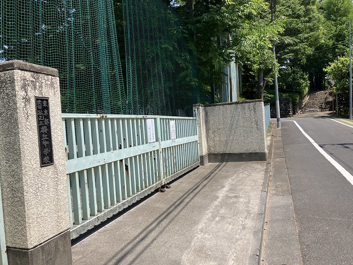 中学校坂は長さが約200mほどで、坂上は緩やかな下り坂、坂下付近は階段になっています。梅丘中学校に出る坂ということで、中学校坂という坂名が付いたのでしょう。坂の途中で小梅坂が合流しています。坂下の階段は石段になっています。自然な雰囲気がいいですね。